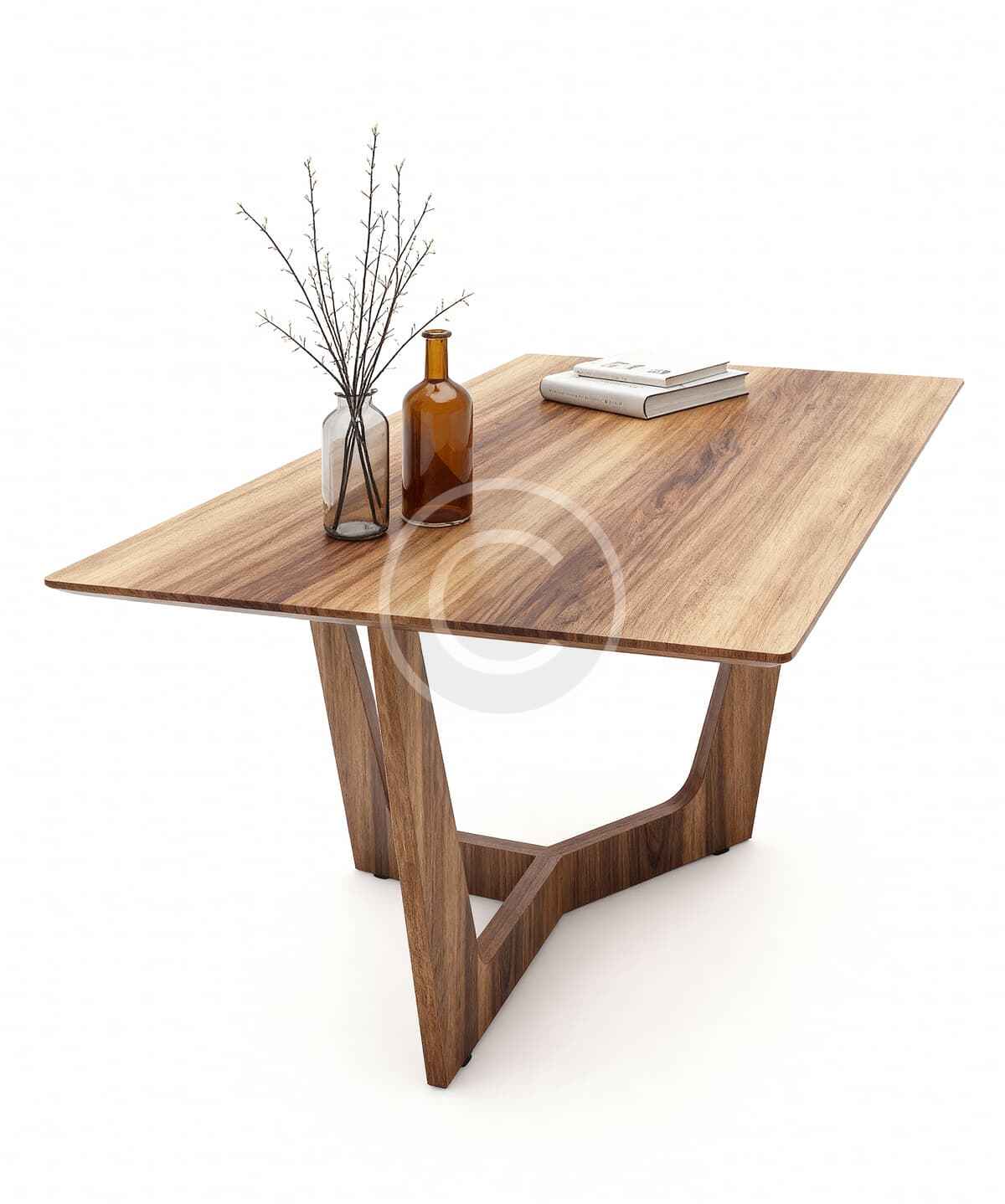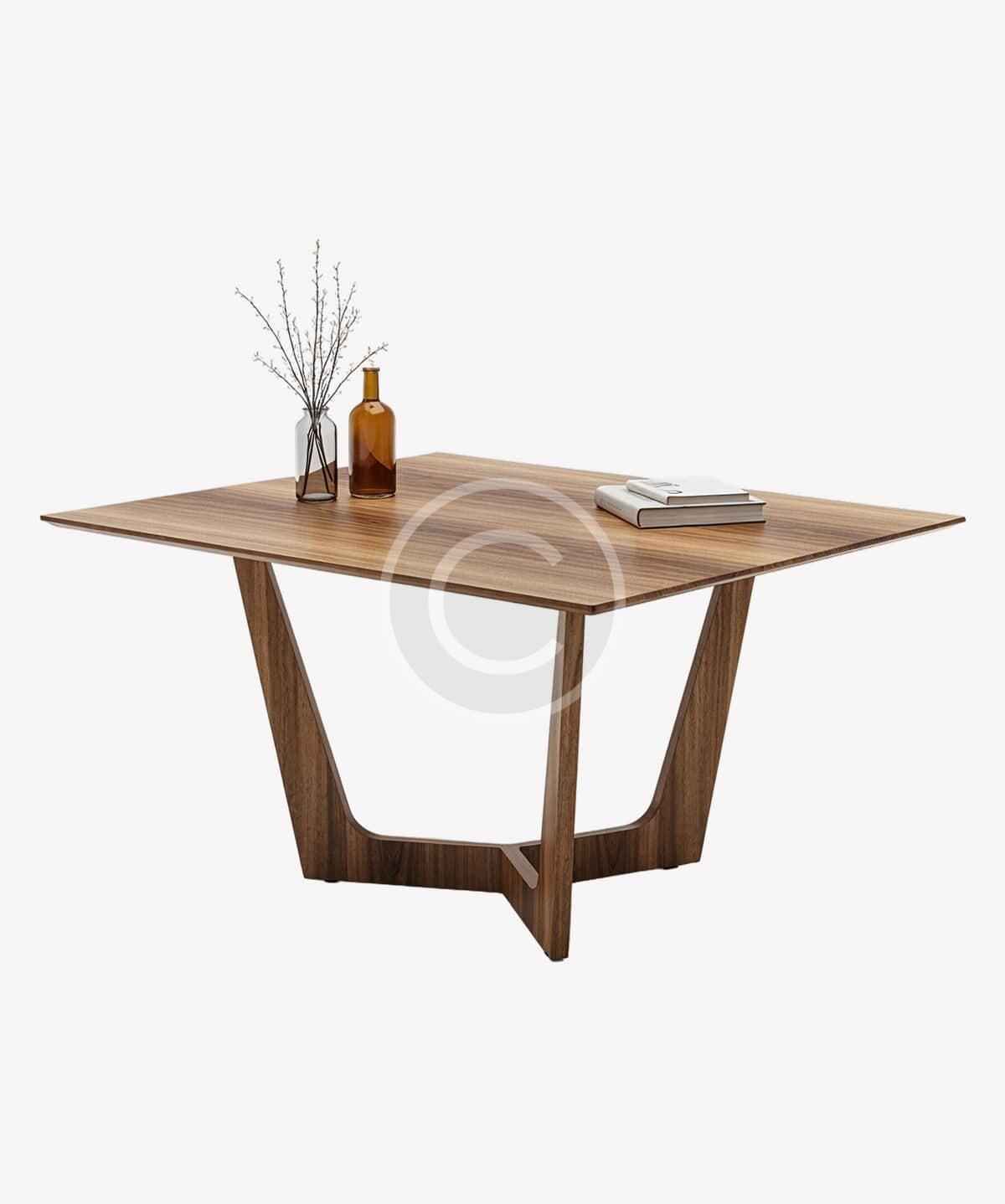 Crafted for contemporary homes, this minimalist walnut dining table features a clean, square top with eye-catching wood grain and a geometric base for added style and stability.